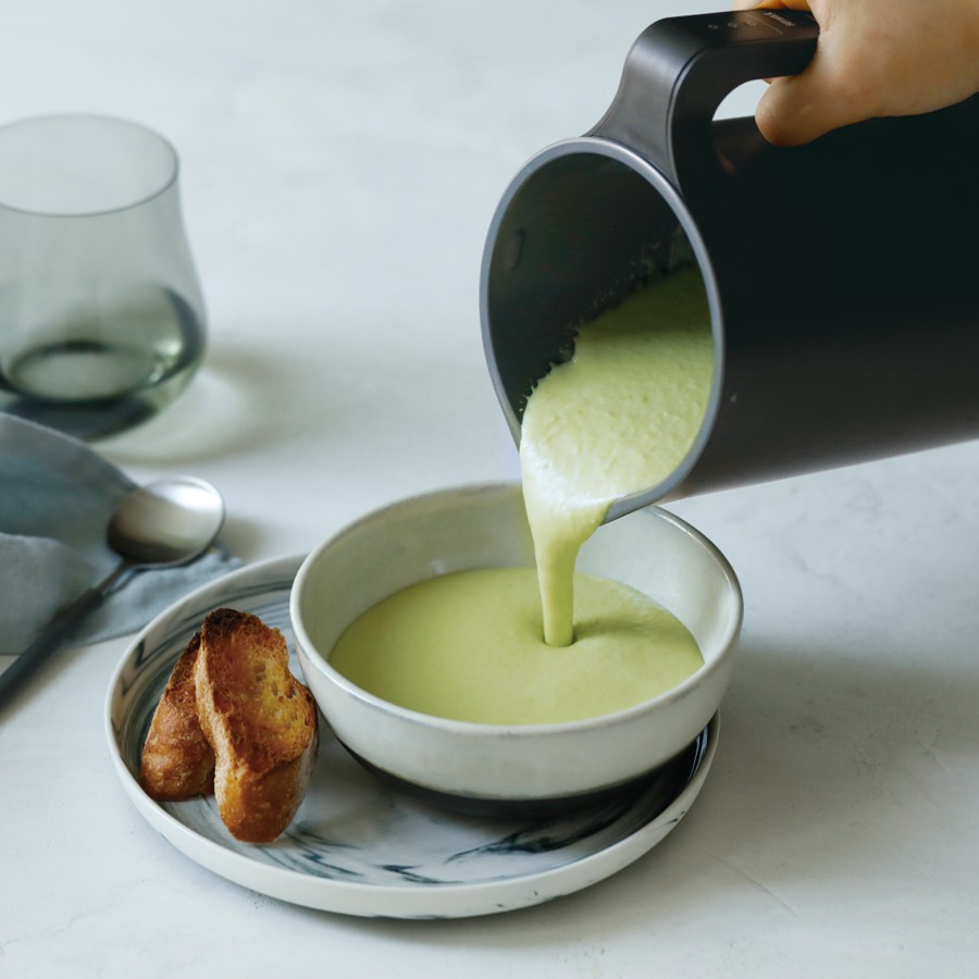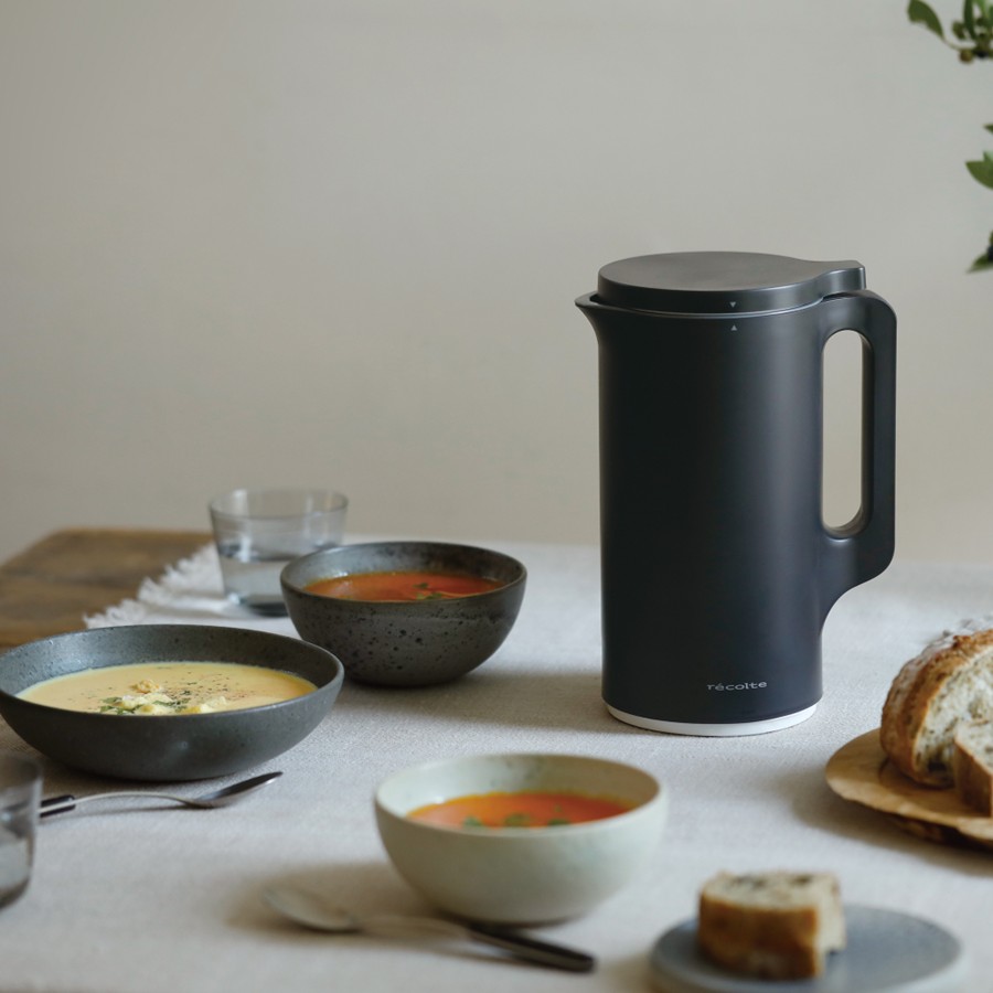 - 特徴材料を入れたら「自動調理ポット」におまかせ。コンロもお鍋もヘラも不要。5つのモードに合わせて撹拌と加熱がプログラミングされた自動調理ポット。手作り豆乳&おからのほか、面倒な裏ごしいらずでなめらかなポタージュスープやペースト(パスタソース)、具材の食感を残したミネストローネなどの食べ応えのあるスープ・おかゆなどが、具材を入れてボタンを押して、ほうっておくだけで作れます。加熱をしないで攪拌だけを行う「JUICE/CLEAN」モードや、保温ができる「WARM」モードも搭載。外観はシンプルなポットのようなデザイン。容量はMAX600mlで、約2~4人分に対応。コンパクトなサイズ感なのでキッチンのちょっとしたすき間に置いて使えます。