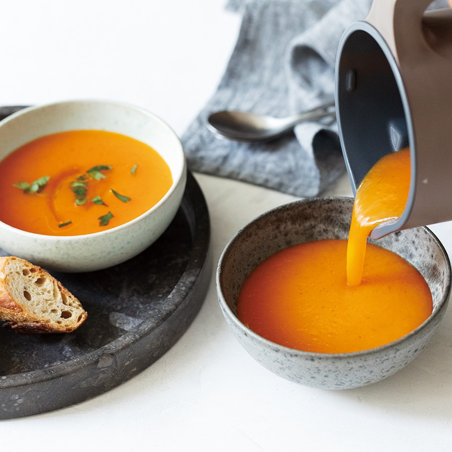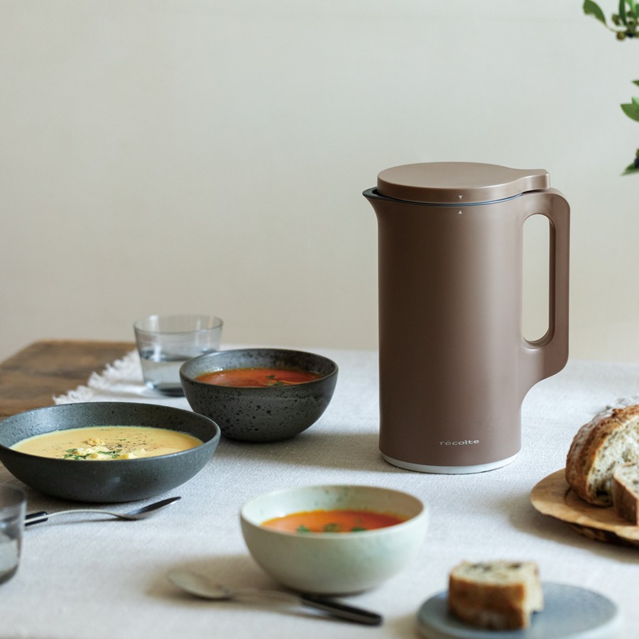 - 特徴材料を入れたら「自動調理ポット」におまかせ。コンロもお鍋もヘラも不要。5つのモードに合わせて撹拌と加熱がプログラミングされた自動調理ポット。手作り豆乳&おからのほか、面倒な裏ごしいらずでなめらかなポタージュスープやペースト(パスタソース)、具材の食感を残したミネストローネなどの食べ応えのあるスープ・おかゆなどが、具材を入れてボタンを押して、ほうっておくだけで作れます。加熱をしないで攪拌だけを行う「JUICE/CLEAN」モードや、保温ができる「WARM」モードも搭載。外観はシンプルなポットのようなデザイン。容量はMAX600mlで、約2~4人分に対応。コンパクトなサイズ感なのでキッチンのちょっとしたすき間に置いて使えます。
