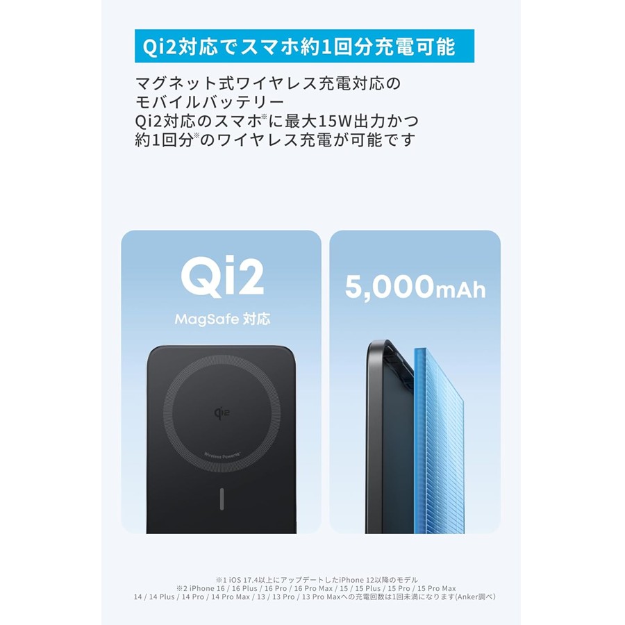 - 特徴薄型設計でポケットやポーチにも収納可能なコンパクトさを実現。外出時などの持ち運びにも便利です。マグネット式ワイヤレス充電対応の5000mAh容量モバイルバッテリーで、Qi2対応のスマホに最大15W出力かつ約1回分のワイヤレス充電が可能です。ケーブルを使用しないため、充電中でも快適にスマホを操作できます。製品底面のUSB-Cポートは最大20Wでの入出力に対応。スマホもバッテリー本体にも急速充電が可能です。