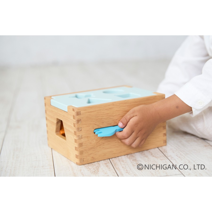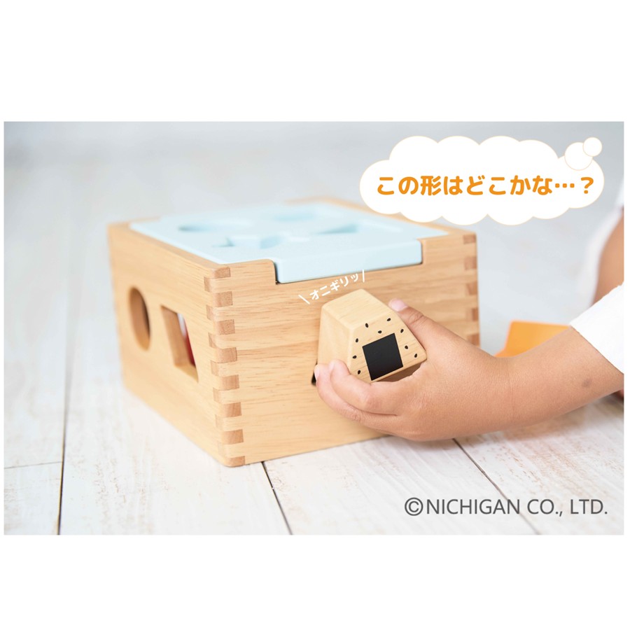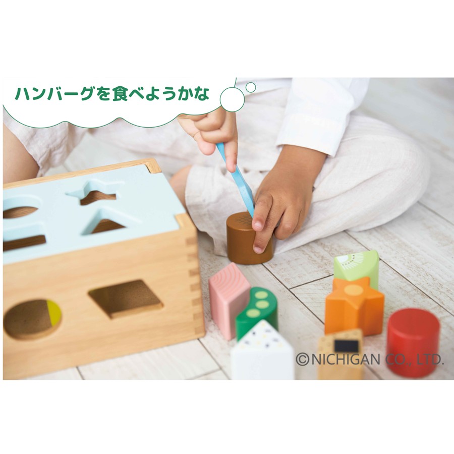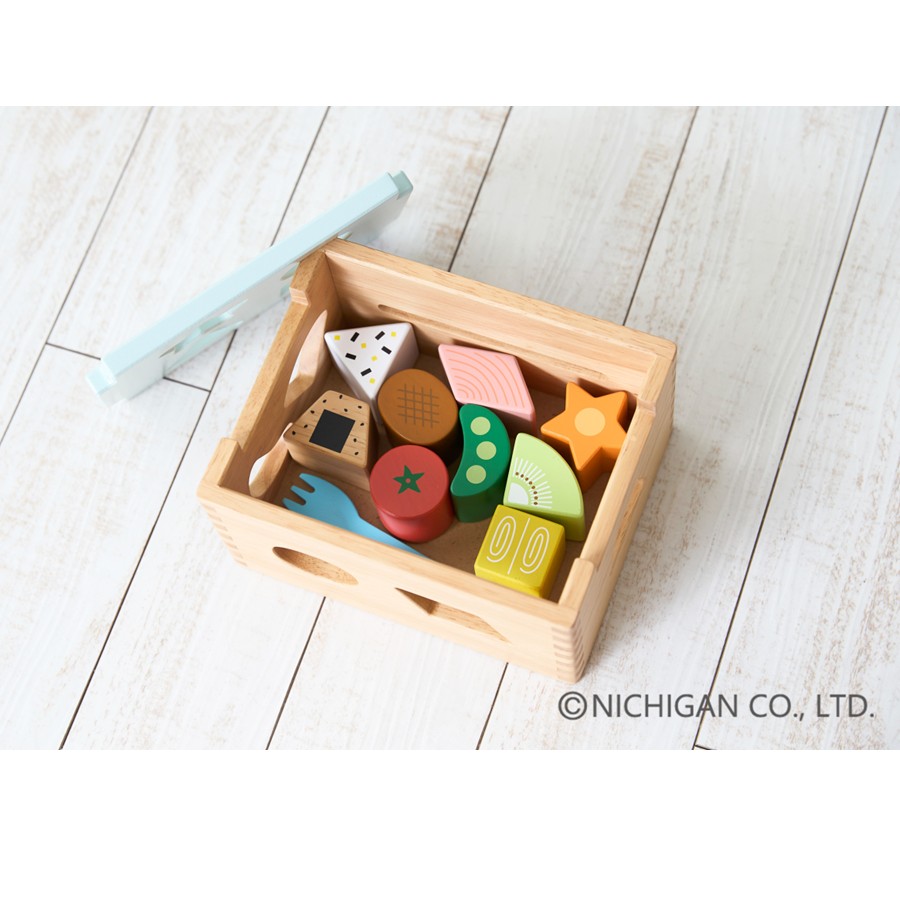 - 特徴お弁当箱をコンセプトとしたパズルボックスとごっこ遊びを兼ねそろえたセット。お弁当のおかずをモチーフとしたブロック9種類とフォークがついています。形の違うブロックをそれぞれの穴に入れることで形状認知力や観察力が育まれるほかにも、フォークとお弁当箱・おかずを用いたごっこ遊びも楽しめます。