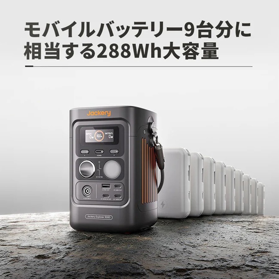 - 特徴Jackery 300Dは、288Whの大容量と最大300W出力を備えた超軽量ポータブル電源。USB-C急速充電で約2.75時間でフル充電、スマホやノートPCなど複数の機器を同時給電可能。リン酸鉄リチウム採用で長寿命、静音設計&LEDライト搭載でアウトドアや防災にも安心。