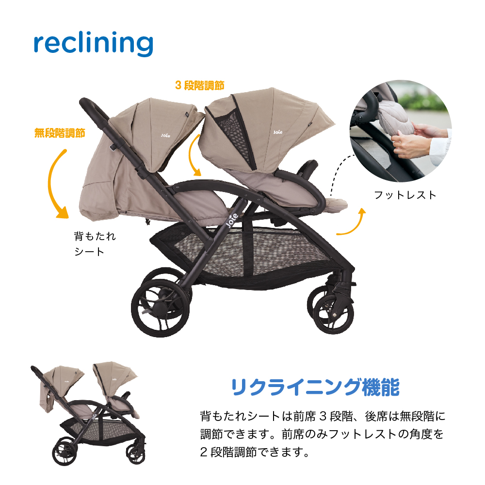 - 特徴シングルタイヤで操作しやすい縦型二人乗りベビーカー