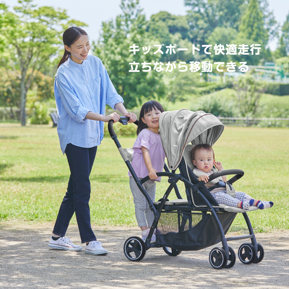 - 特徴兄弟・姉妹でのお出かけが楽しくなるベビーカー、後ろ席は立っても座っても乗れる2way仕様