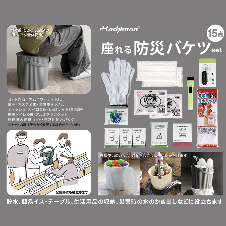 - 特徴座れるフタ付きバケツに入った防災グッズセットです。