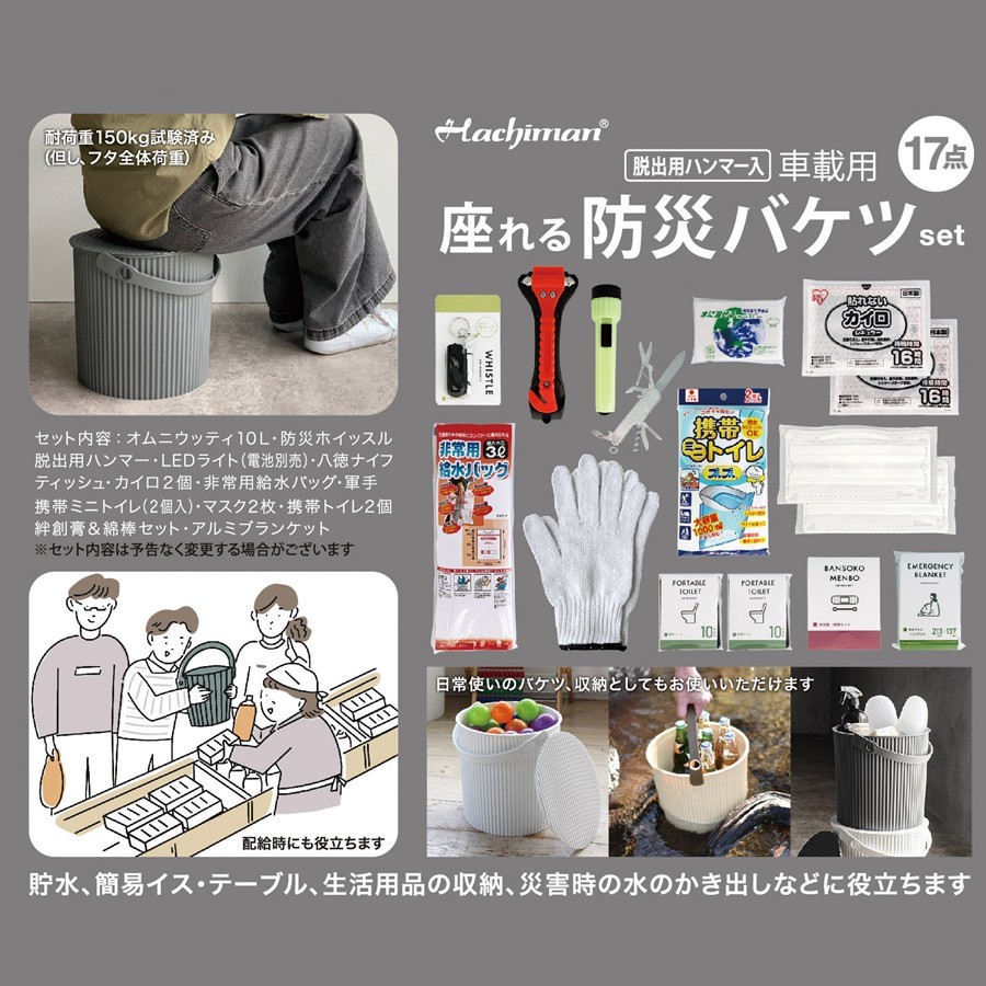 - 特徴座れるフタ付きバケツに入った防災グッズセットです。